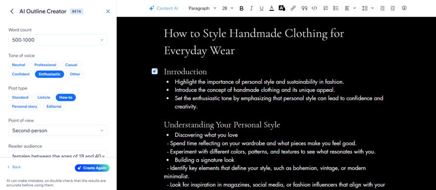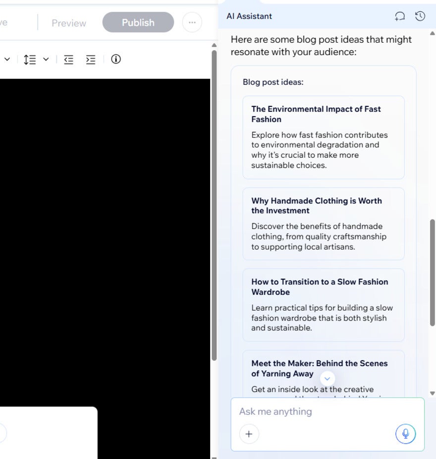 Home » Website Builders » How To Start a Blog With Wix (2026 Guide) How To Start a Blog With Wix (2026 Guide) We may receive a commission from our partners if you click on a link and purchase a product or service on their website. Learn more Written by Annie Angus Updated on August 27, 2025 Comments: 0 On this page Cost of Starting a Wix Blog Accessing Wix's Blogging Platform Designing Your Blog Wix's Writing Support Wix Blog Monetization Tips for a Great Wix Blog Summary Our most recent 2025 website builder research highlighted Wix as the best all-in-one solution for building, so it’s no surprise that it also has outstanding blogging tools. Still, after using WIx myself, I know it can be a little overwhelming to master.I’ve got you covered. My Wix blogging platform review shows you how to start a blog with Wix, covering all-important considerations, such as AI writing tools, blog design features, and monetization opportunities. How Much Does Starting a Wix Blog Cost? Wix has a free-forever plan which allows you to start a blog without paying a penny. The free plan is a great way to test out Wix’s blogging platform and comes with plenty of SEO, blog management, and analytics for successful blogging.However, there are notable limitations of the free plan to be aware of:500MB of storage and 1GB of bandwidthWix domain nameWix ads on your site 🤔Should I blog on Wix’s free plan? Wix’s free plan is good for personal blogs, but if you’re trying to build trust and brand awareness, I recommend upgrading to the Light plan. This removes ads, upgrades your storage, gives you marketing tools to grow your blog, and lets you connect a custom domain to your site.If you choose to upgrade, Wix’s pricing plans range from $17 to $159 per month, when billed annually. The $17-per-month Light plan is ideal for most blogs. However, if you want to accept donations or link to products you’re selling in your blog posts, you’ll need the $29-per-month Core plan. Wix's Plans Free ($0) – For testing Wix Light ($17) – For portfolios and personal sites Core ($29) – For small and growing online stores Business ($36) – For established businesses Business Elite ($159) – For large online stores with complex needs Where Can You Find Wix's Blogging Platform? To access Wix’s blogging platform, you’ll need the Wix Blog app. While some blogging templates automatically install this app to your site, you can manually download from within the editor of any template.To download Wix Blog, select the “Add Apps” icon from the left sidebar. Type “Wix Blog” into the search bar and hit install.Wix’s app market icon is a pink grid of squares in the editor’s sidebar. Source: Website Builder ExpertOnce you have the app installed, enter your blog page from within Wix’s editor by selecting “Pages” from the left sidebar and navigating to “Blog Pages.” How To Design Your Wix Blog I completed my initial Wix setup with the help of its AI website builder. After asking important questions – such as my blog’s name, the type of content I’ll share, and my blog’s unique selling point – I was taken to a blog setup checklist, which gave me two options to design my site:#1. Generate a Design with AIWix’s AI website builder opens up an AI chatbot which generates a site brief and a website preview based on the information that I inputted during signup.If I wasn’t happy with the design, I could tweak the site structure, design, theme, and layout details of the brief and regenerate.#2. Pick a TemplateAlternatively, you can select from one of Wix’s 2,000+ templates. After selecting this route, I was pleased that Wix had used my signup information to recommend templates fit for my fashion blog.Wix’s recommended templates helped me know what to look for in a fashion blogging template. Source: Website Builder ExpertIf the recommendations don’t take your fancy, Wix has a “Blog” tab at the top of its template library, where you can filter by blog types such as “Personal,” “News and Business,” “Food and Travel,” and “Sports and Wellness.” At my time of writing, there are 143 unique blogging templates to choose from, so you’re sure to find something you like.Editing Your Blog PageOnce you’re happy with your initial template, head into Wix’s editor to personalize it. While I could talk in depth about building a website with Wix, I’m going to focus on design elements in the blog pages for this article.The blog design controls are easily found by clicking anywhere on the page and selecting the white settings button.The blog settings pop up was organized with user-friendly tabs. Source: Website Builder ExpertWix gave me more control over the look and feel of my blog page than any other website builder I’ve tested. I could edit:The display: What shows on my post previews, such as author name, publish date, reading time, social sharing buttons, and various engagement metrics.The layout: How you want your post previews to be presented on the blog page. For example, I could show a single column, a grid of header images, or entire posts.The design: Change the colors and fonts of different elements, such as buttons and ratings. I could control my main post feed and any category feeds created.There were plenty of layouts I could experiment with to show my blog posts in the optimal way. Source: Website Builder ExpertCreating Individual Blog PostsIn the blog post editor, you’ll have standard text formatting controls, such as adding links, headings, indenting the page, changing font size and color, and adding bullet points and numbered lists.I was a little frustrated that I couldn’t change the background color of my individual blog posts in the editor like I could with Squarespace. Does Wix Help You Write Blog Content? If you’re not a wordsmith, don’t worry – Wix has plenty of AI tools to help you build your business blog.Planning Topics and OutlinesWix’s AI Topi